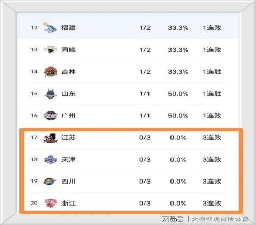 江苏队、天津队、四川队以及浙江队,4支球队都是开局3连败,至今未尝一胜,尤其是浙江男篮,作为上赛季的季后赛球队,新赛季开赛以来排名垫底,确实令人大跌眼镜。