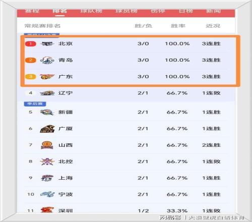 开局取得3连胜的球队有3支,分别是北京队、青岛队和广东队,三支球队目前高居排名前三位;