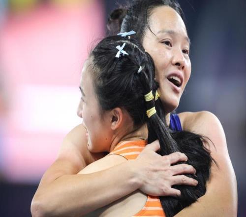 韦永丽和16岁小将陈妤颉拥抱。