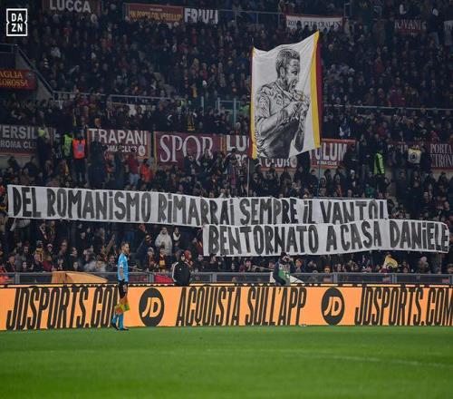 比赛进行到第10分钟,看台上挂出了第一批横幅。南看台写道:“这里永远是你的家,欢迎回家,DDR。”台伯河看台回应:“罗马精神的骄傲永远属于你,欢迎回家,达尼埃莱。”