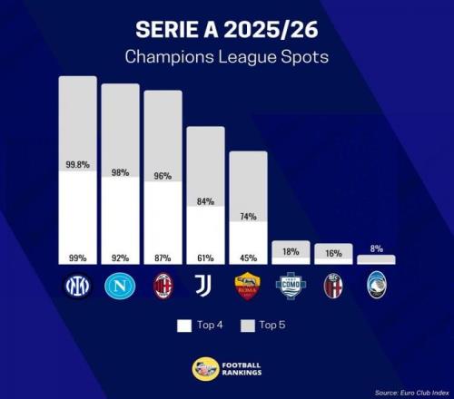 意甲方面的,目前有38%的概率获得五个下赛季欧冠席位机会,Football Rankings对意甲本赛季前五预测如下的: